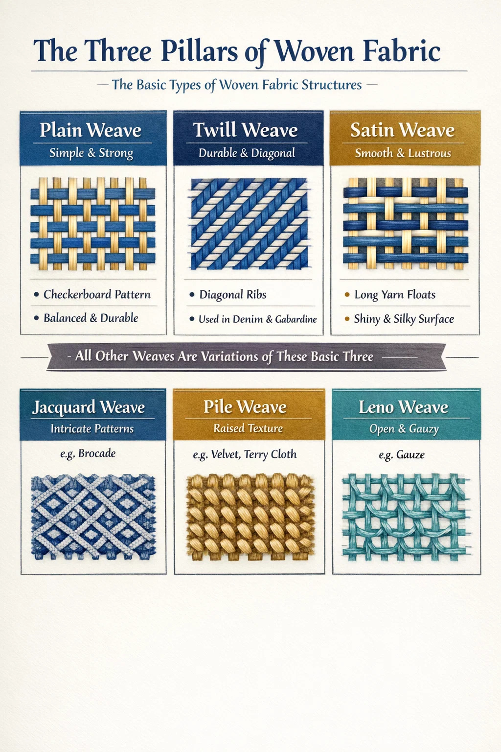 Obwohl es Hunderte spezifischer Marktnamen für Textilien gibt, gibt es sie technisch gesehen drei grundlegende Arten von Webstoffen Strukturen, von denen fast alle anderen abgeleitet sind: Leinwandbindung, Köperbindung und Satinbindung . Jede andere Variante, wie zum Beispiel Jacquard-, Dobby- oder Florbindungen, ist eine komplexe Modifikation dieser drei grundlegenden Verflechtungsmuster. Das Verständnis dieser Kategorien ist wichtig, um die Haltbarkeit, den Faltenwurf und den Nutzen eines Textilprodukts zu ermitteln.