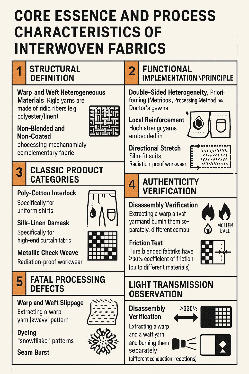 Heterogene Kett- und Schussmaterialien: Die Kettgarne bestehen aus starren Fasern (z. B. Polyester/Leinen), während die Schussgarne aus flexiblen Fasern (z. B. Baumwolle/Viskose) bestehen, wodurch ein mechanisch komplementäres Gewebe entsteht.