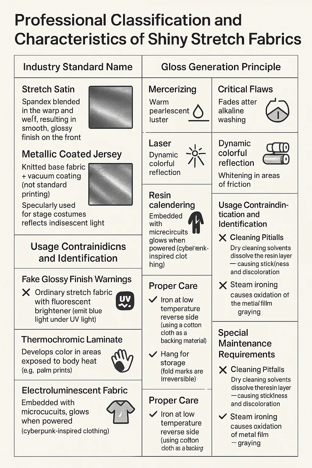 Fallstricke bei der Reinigung: Trockenreinigungslösungsmittel lösen die Harzschicht auf → verursachen Klebrigkeit und Verfärbungen. Dampfbügeln führt zu einer Oxidation des Metallfilms → Vergrauung