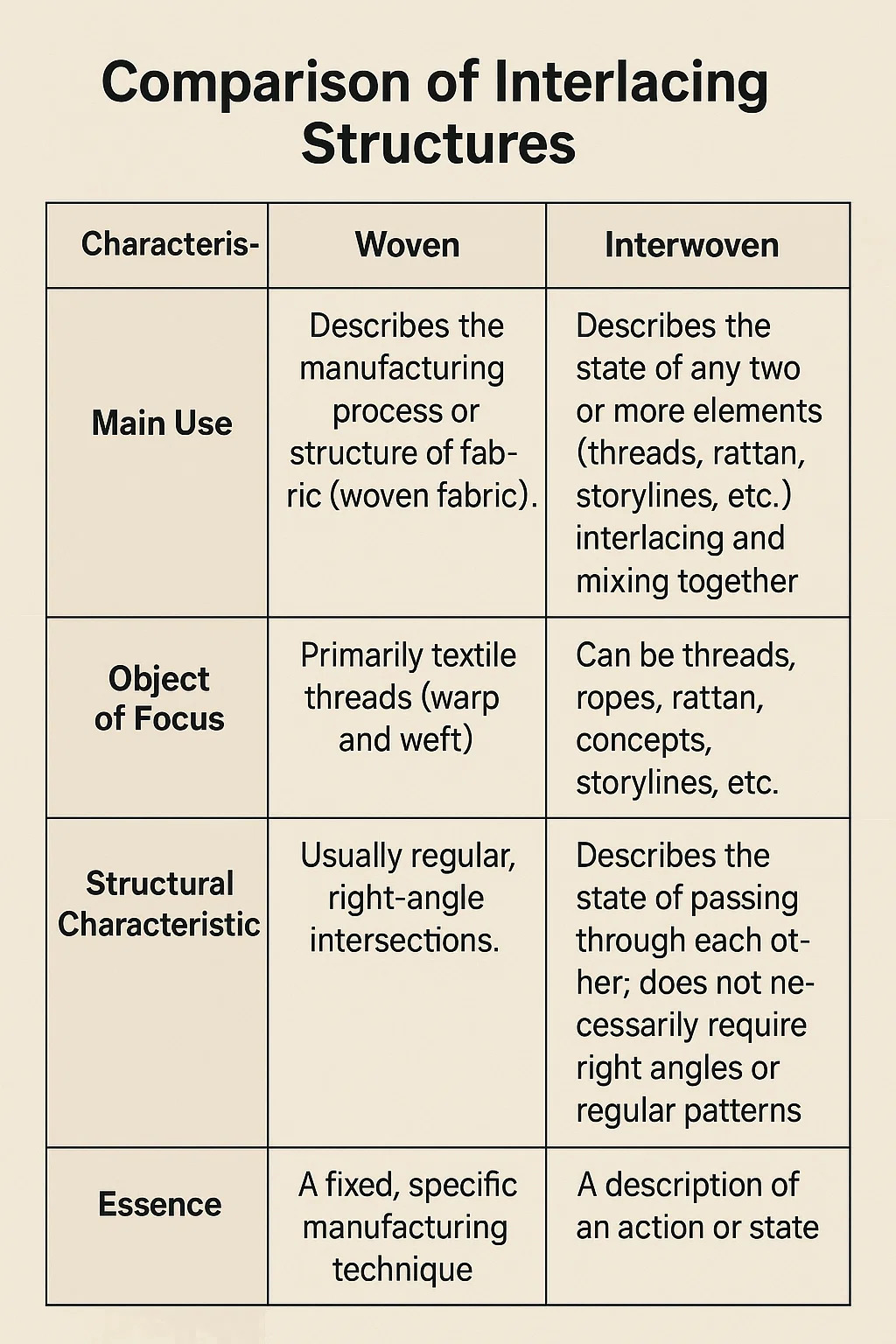 | Primäre Verwendung | Beschreibt den konkreten Herstellungsprozess bzw. die fertige Struktur von Textilien (Gewebe). | Beschreibt den Zustand, in dem zwei oder mehr Elementesätze (Fäden, Blätter, Handlungsstränge usw.) kreuz und quer verlaufen oder vermischt sind. |